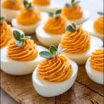 - Garnish: Garnish each deviled egg with small sprigs of fresh sage and thyme or a sprinkle of finely minced chives to add a festive touch and fresh aroma.