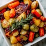 Keywords: Thanksgiving roasted vegetables, roasted carrots and potatoes, Brussels sprouts recipe, holiday side dish, oven roasted vegetables, cranberry roasted veggies, vegetarian Thanksgiving side
