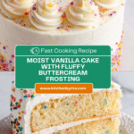 This classic vanilla cake recipe features a moist, fluffy two-layer cake made from scratch, paired with a smooth and creamy vanilla Swiss meringue buttercream. Perfect for celebrations, the cake is decorated with colorful confetti sprinkles and elegant piped rosettes, creating a festive and delicious dessert that is sure to impress.