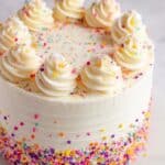 This classic vanilla cake recipe features a moist, fluffy two-layer cake made from scratch, paired with a smooth and creamy vanilla Swiss meringue buttercream. Perfect for celebrations, the cake is decorated with colorful confetti sprinkles and elegant piped rosettes, creating a festive and delicious dessert that is sure to impress.