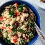 This Vegan Lemon-Garlic Mediterranean Quinoa is a vibrant and wholesome dish that can be served warm or as a salad. Featuring protein-packed quinoa cooked in vegetable broth, tender kale, creamy white beans, fresh roma tomatoes, briny kalamata olives, and a zesty lemon-garlic dressing made with olive oil, this Mediterranean-inspired recipe is both nutritious and flavorful. Perfect for a light lunch or dinner, it combines fresh ingredients with simple cooking techniques for a satisfying vegan meal.