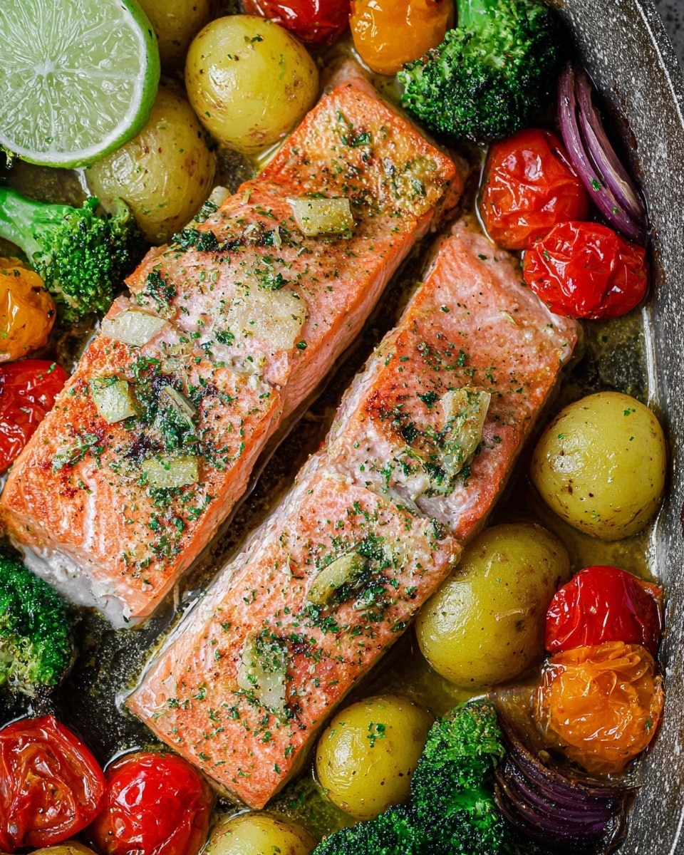 This Za’atar Garlic Salmon recipe features tender salmon fillets seasoned with aromatic za’atar spice and fresh garlic, baked alongside a vibrant medley of baby potatoes, grape tomatoes, and broccoli. Drizzled with quality extra virgin olive oil and finished with a fresh squeeze of lemon, this dish delivers a flavorful and healthy Mediterranean-inspired meal that’s perfect for any occasion.
